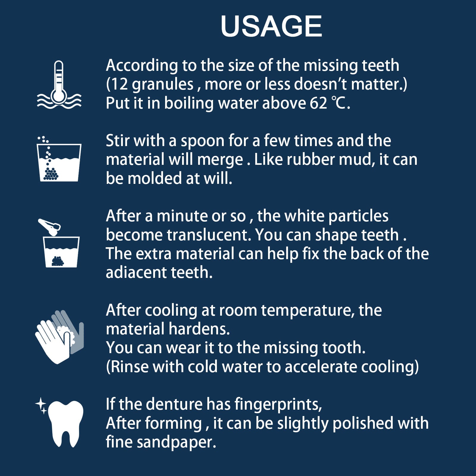 Our denture decorative dental kit contains thermoplastic resin, acrylic resin. It can have strong wear resistance, easy deformation practicability and material safety, avoid dust and bacteria. The way to use it is simple: according to the size of the missing tooth (12 grains, the number does not matter), it is placed in boiling water above 62 degrees Celsius, after which a few times with a spoon, the material will fuse together. Like rubber mud, it can be shaped at will. Then after about a minute, the white particles become translucent and you can shape the teeth. Additional material can help repair the back of the adjacent tooth after cooling at room temperature, the material hardens, and finally you can decorate it on the tooth (rinse with cold water to speed up cooling), if the denture has fingerprints, after the molding can be lightly sanded. And the use of environmentally friendly materials, you can rest assured to use.