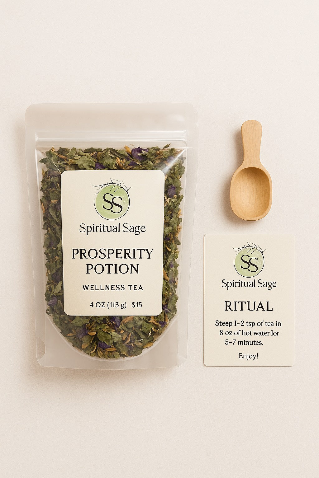 Brew abundance into your day with Prosperity Potion. Infused with energizing green tea, uplifting lemongrass, and sacred tulsi, this golden brew keeps your mind sharp and your energy flowing for manifestation work and inspired action.