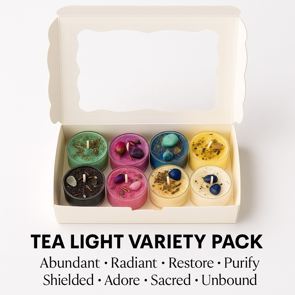 Bring the magic of all eight Spiritual Sage Manifestation Candles into your sacred space with this Tea Light Variety Pack. Perfect for sampling each intention or gifting a loved one, these mini versions carry the same powerful energy, herbs, and crystals as the full-size candles.